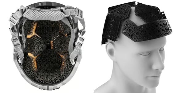 이러한 문제를 해결하기 위해 독일의 국방 R&D 전문 기업 센드 노즈 나이트비전(Send Nods Nightvision)과 미국의 하드 헤드 베테랑(Hard Head Veterans) 같은 혁신적인 기업들은 3D프린팅 ‘격자 구조(Lattice Structure)’ 패딩을 개발했습니다. 이는 컴퓨터 알고리즘을 통해 설계된 복잡한 그물망 형태의 내부 구조로, 기존 폼 패딩을 완벽하게 대체합니다.
