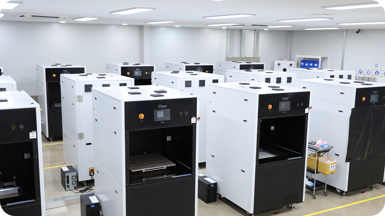 글룩은 제1 팩토리와 제2 팩토리에서 40대 이상의 산업용 SLA 3D프린터를 가동 중입니다. 이는 600mm급부터 1,000mm급 초대형 장비까지 포함하며, 글룩이 직접 양산 신뢰성을 높이기 위해 튜닝한 전문 장비들로 구성되어 있습니다.