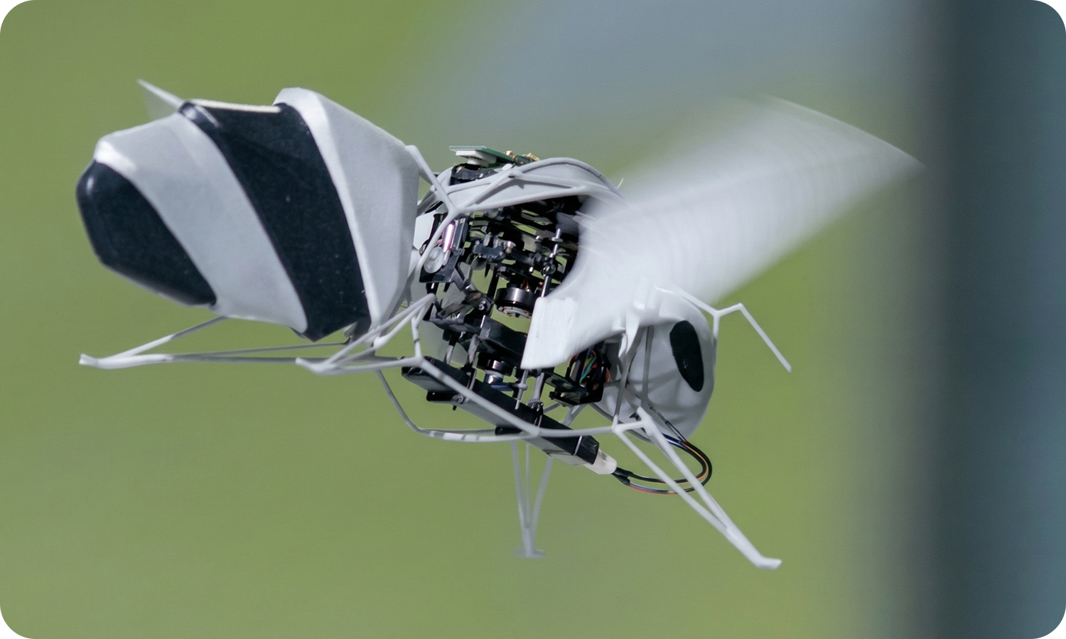 The biggest hurdle in creating the BionicBee was its weight. All essential components, such as the motor, battery, communication circuits, and gearbox, had to fit inside a light 34g body. Even a slight increase in component weight would cause flight performance to drop drastically.