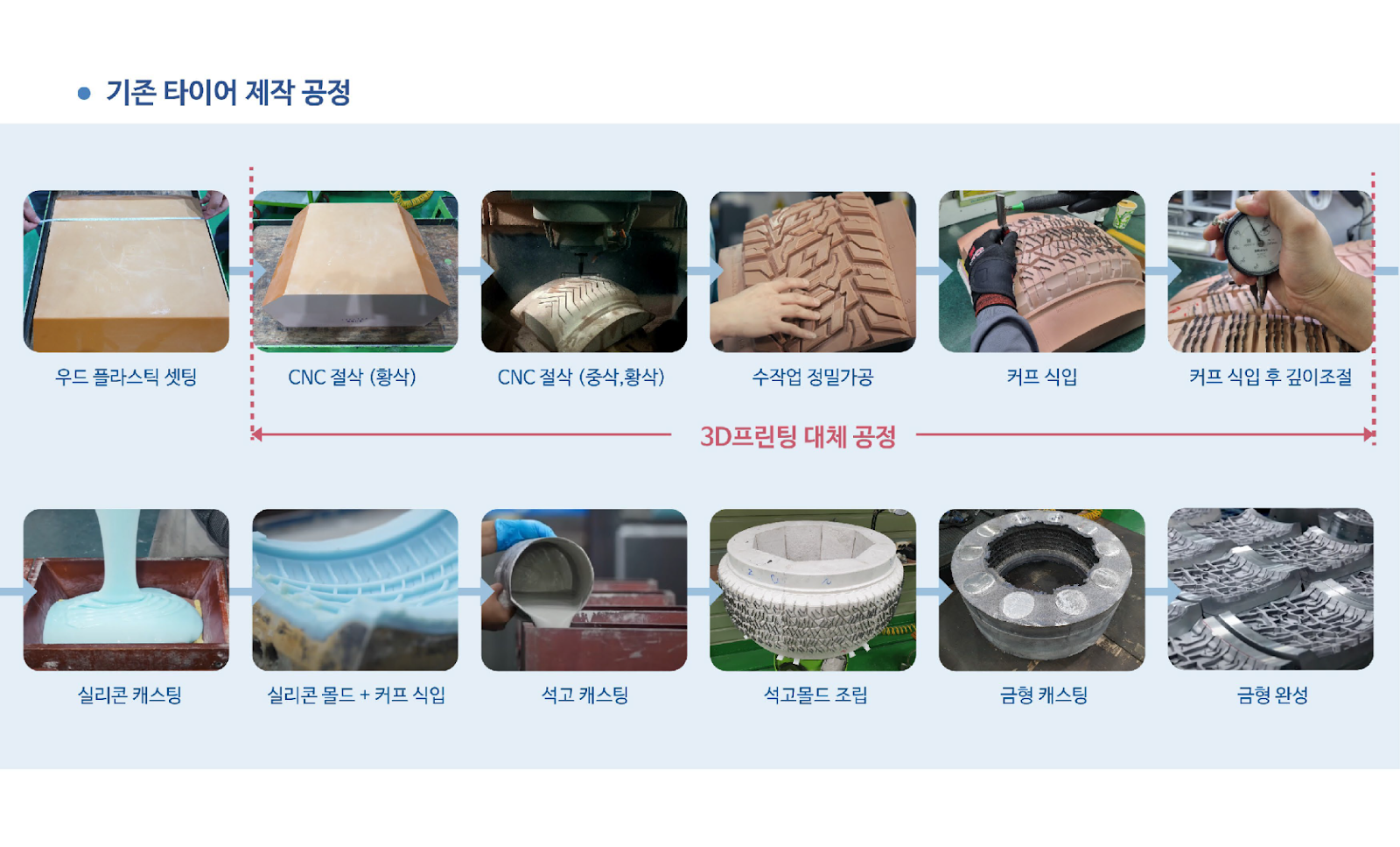 타이어 제조 공정의 첫 시작은 타이어 금형제작이며, 타이어 금형제작 공정에서 가장 첫 단계는 타이어 마스터모델 제작입니다. 타이어 산업은 수십 년간 정밀 가공 중심의 공정 체계를 선호해 왔으며, 마스터모델 제작에만 19단계에 이르는 복잡하고 정교한 공정과 고숙련 인력의 숙련된 작업이 필요하였습니다.