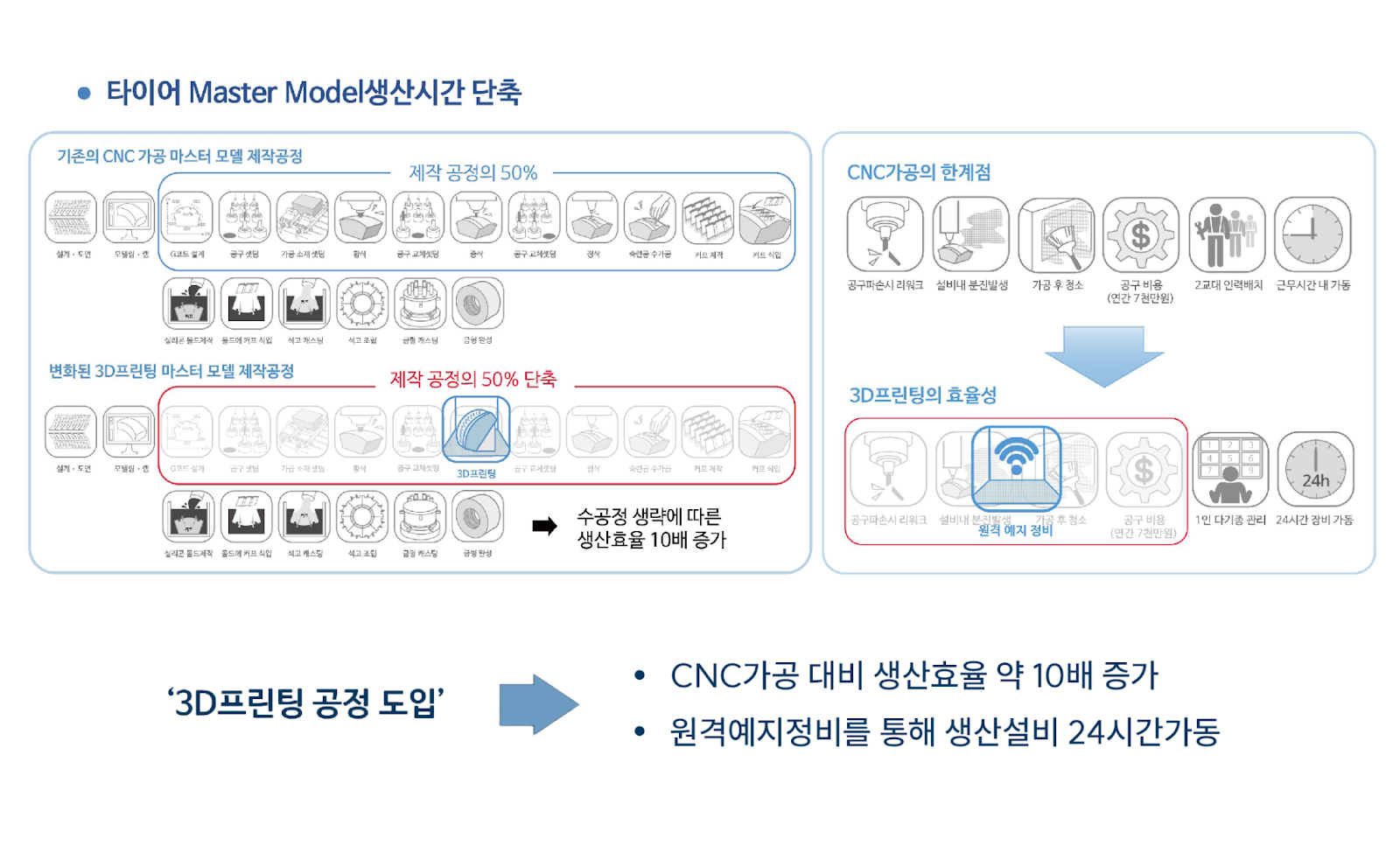 타이어 마스터모델 3D프린팅 양산 프로젝트는 과학기술정보통신부의 ‘3D프린팅 제조혁신 실증지원사업(2024~2026)’의 일환으로 실증 중이며, 한국프리시전웍스(한국 앤 컴퍼니그룹 금형 계열사)와 공동으로 개발하고 있습니다. 해외에서 수입해 오던 일부 공정을 국내 독자 기술로 대체할 수 있는 가능성을 확보하였으며, 기존 제조 인프라를 디지털 기반으로 전환할 수 있는 테스트베드 역할도 수행하고 있습니다.