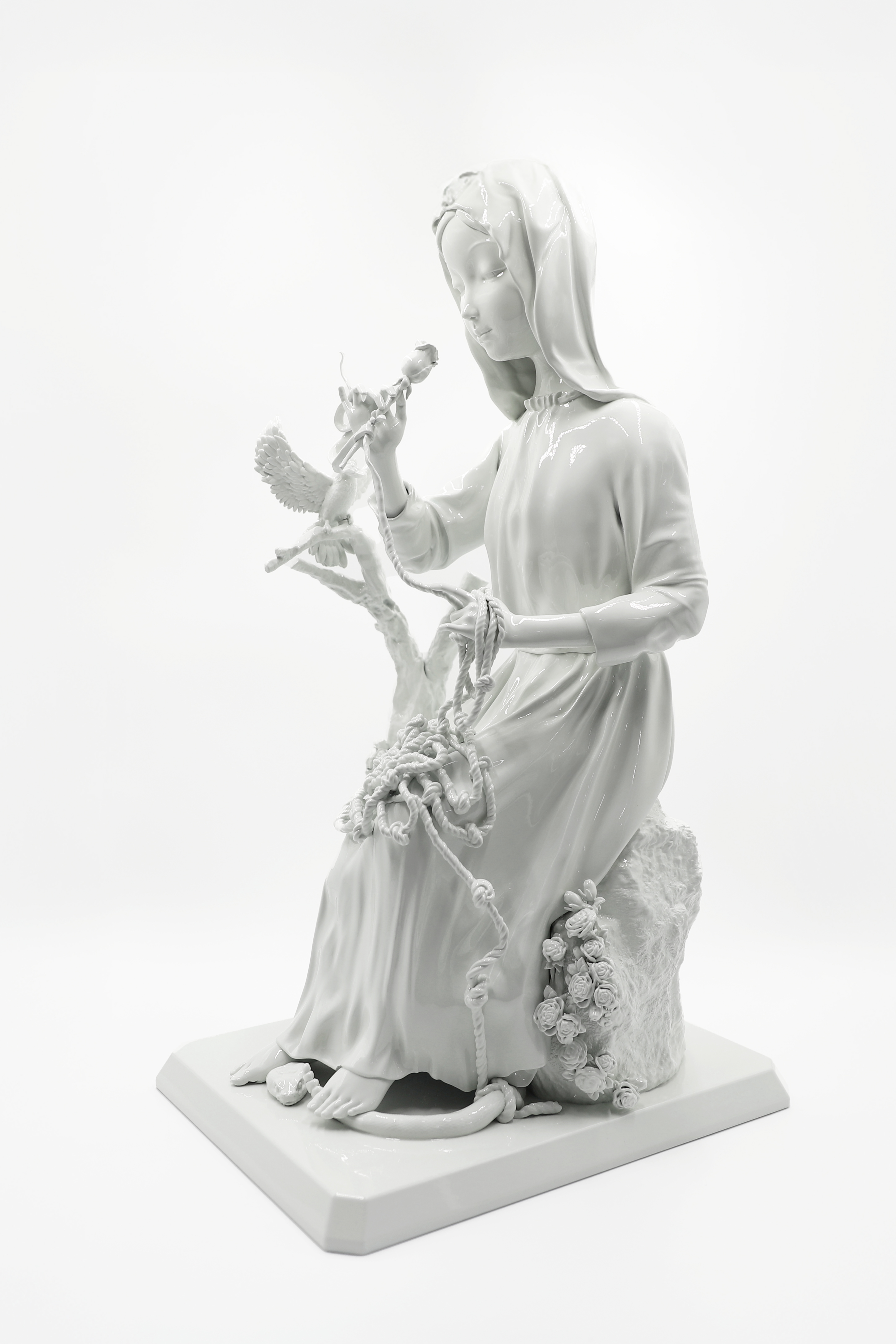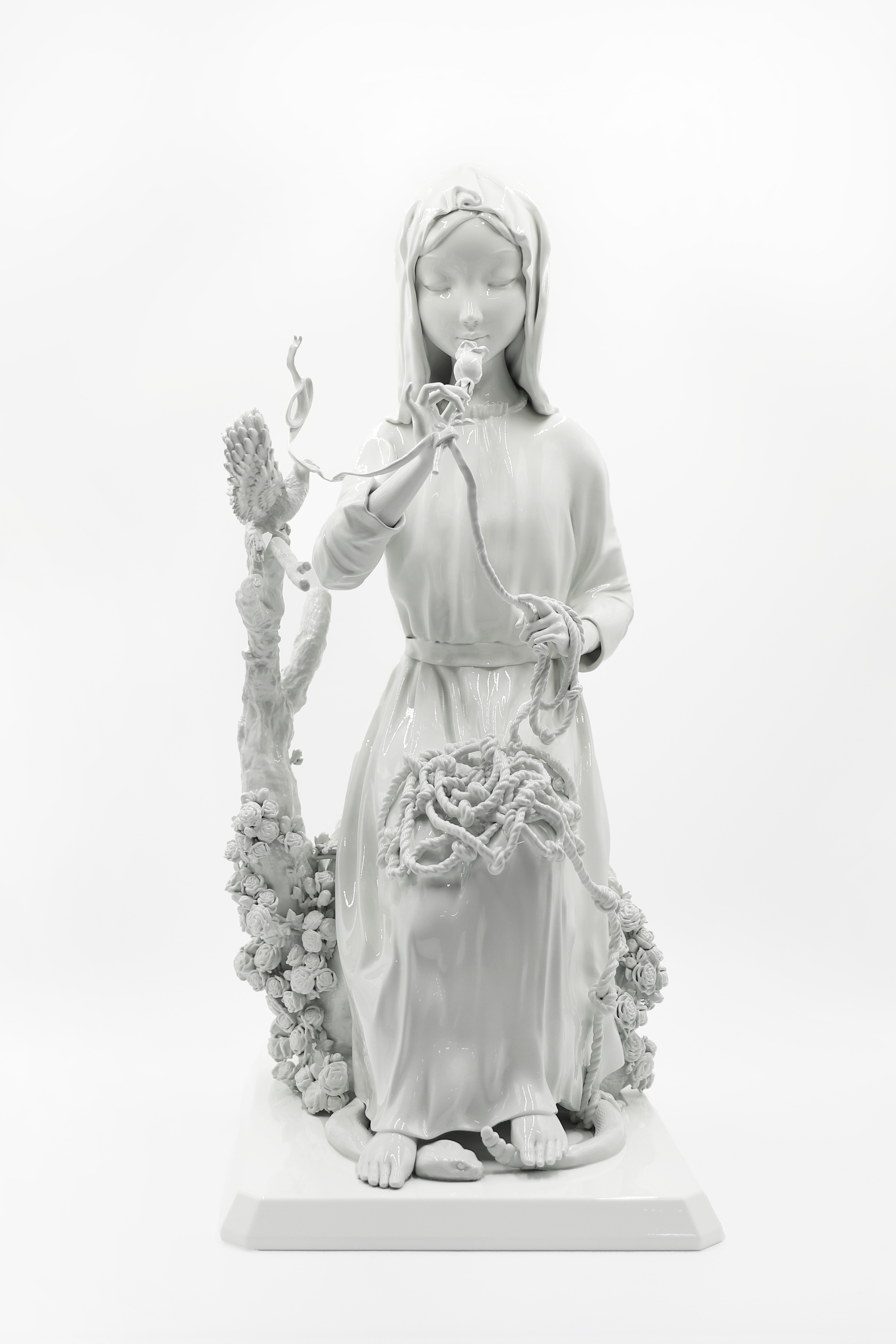 이수경 작가는 이 상징적인 이미지를 현대 조형으로 재해석했습니다. 성모님이 얽히고설킨 매듭 사이로 피어난 장미 한 송이를 바라보는 장면은, 누구나 삶 속에서 마주하는 복잡한 매듭을 다정한 시선으로 풀어내는 존재를 상징합니다.