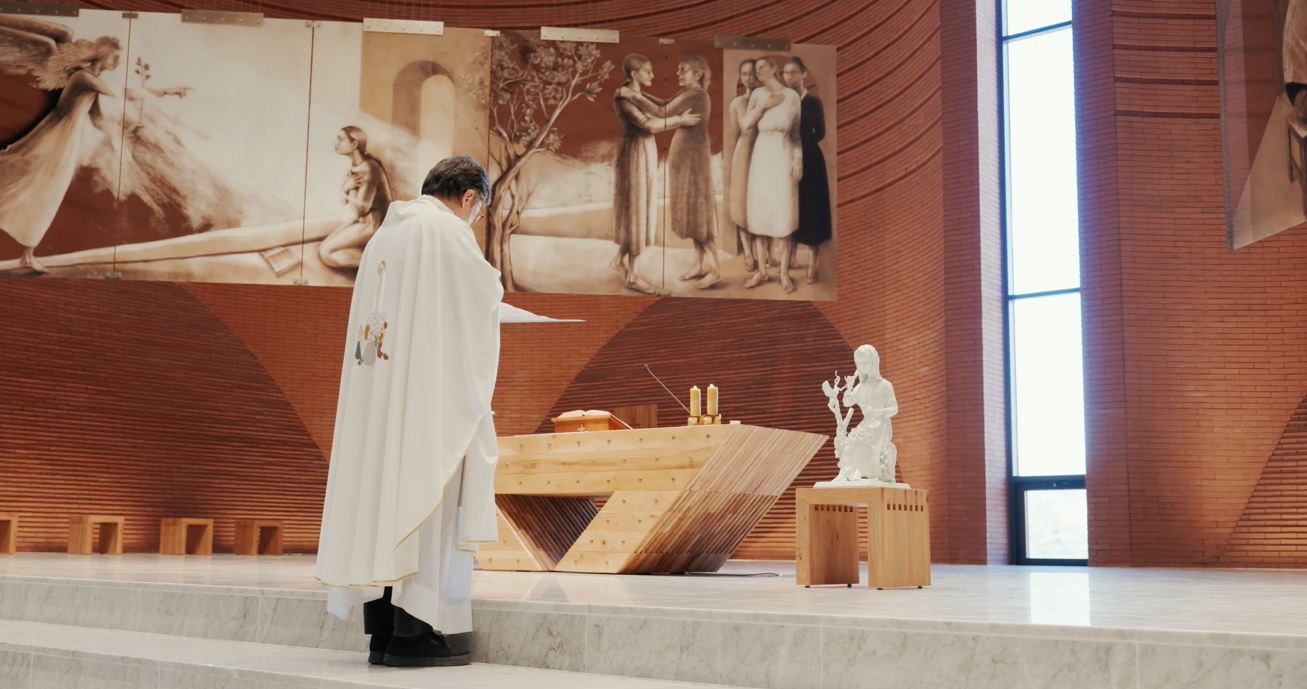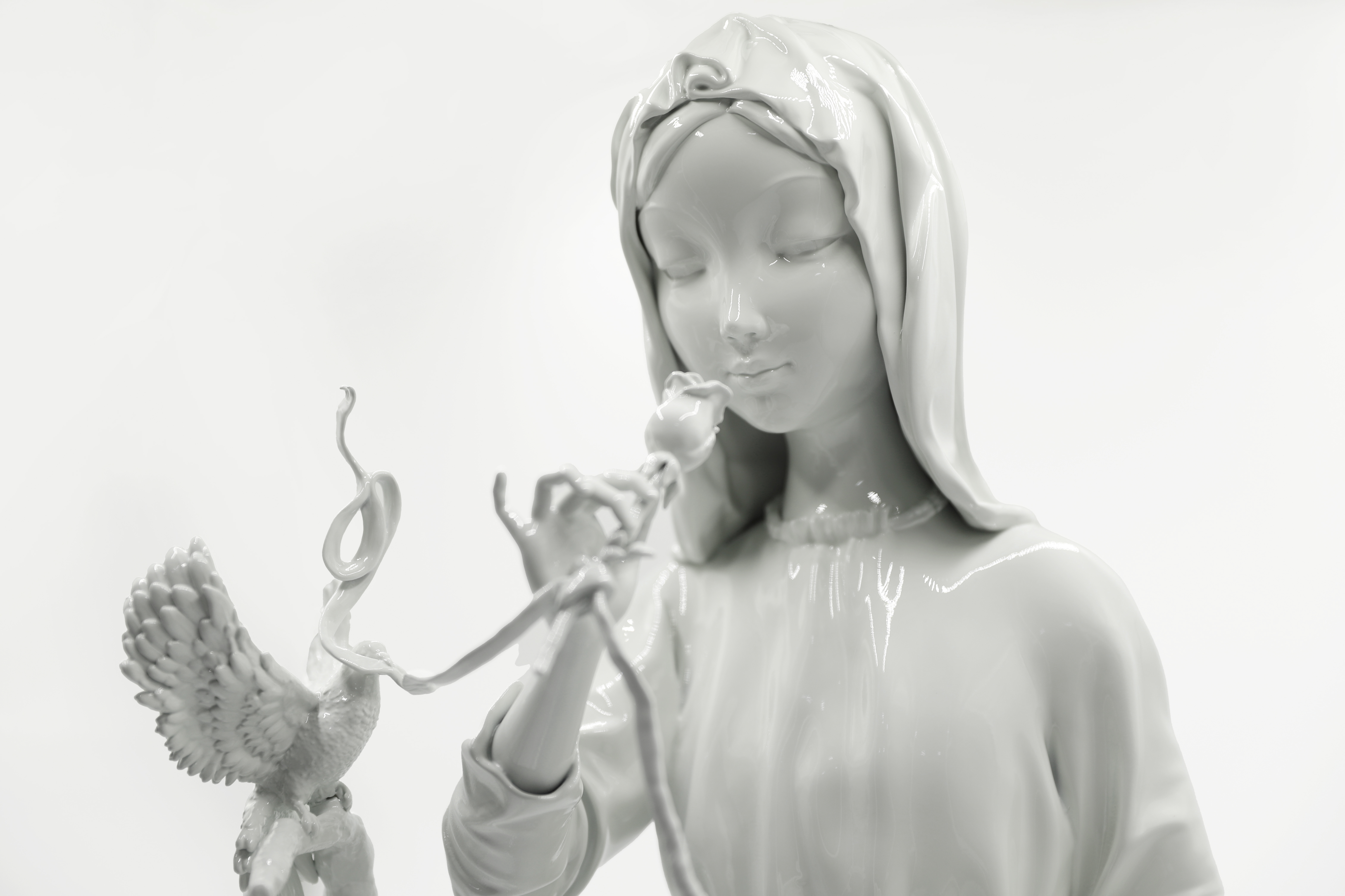 성모상의 앉은 자세와 온화한 미소는 한국 불교 조각의 대표작인 반가사유상에서 영감을 받았고, 의복의 흐름과 조형적 완급은 미켈란젤로의 피에타에서 착안되었습니다. 이처럼 동서양의 예술적 언어가 결합된 작품은 정밀한 디지털 모델링과 고해상도 3D프린팅 기술을 통해 조형적 완성도를 높였습니다.