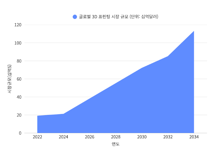 글로벌 3D 프린팅(적층제조) 시장은 연평균 20%이상 성장하며 2030년에는 400억 달러를 넘어설 것으로 예측됩니다.
