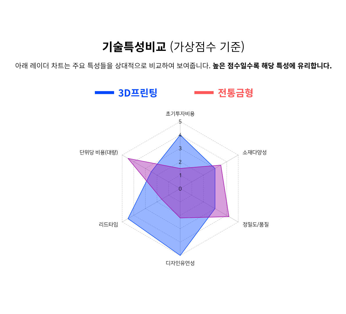 3D프린팅과 전통적인 금형제작 방식은 여러 측면에서 뚜렷한 장단점을 가집니다.