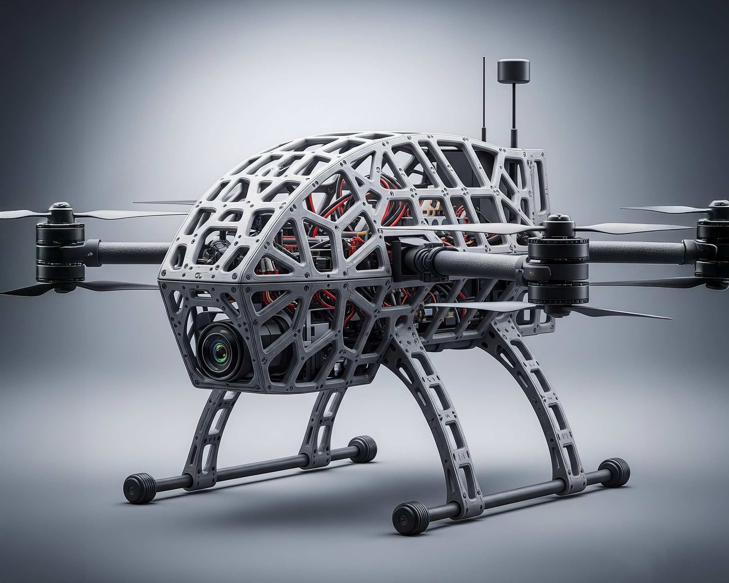 - 경량화(Light-weighting): 내부를 복잡한 격자(Lattice) 구조로 채우거나 위상 최적화(Topology Optimization) 설계를 적용해, 기존의 강도는 유지하면서 무게와 재료 사용량을 획기적으로 줄일 수 있습니다.