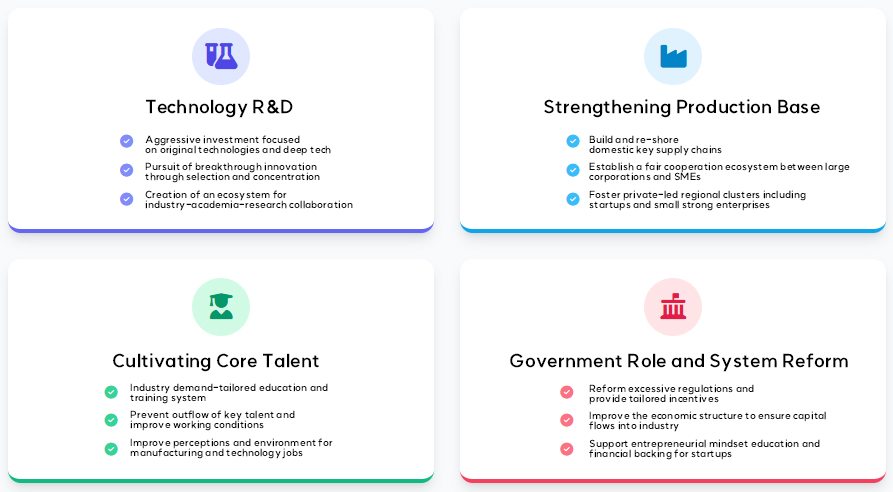 So what should we do? To overcome China's fierce challenges and internal structural issues and regain our status as a manufacturing powerhouse, the following four strategies are urgently needed.