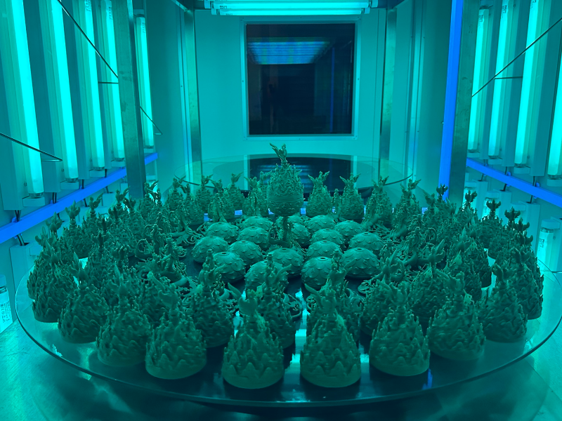 백제금동대향로 굿즈는 3D프린팅 기술의 설계 유연성 덕분에 복잡하고 정교한 조형물을 일정한 품질로 제작할 수 있었습니다. 3D프린팅은 전통적인 제조 방식으로는 구현하기 어려운 고난도 디자인도 가능하게 하며, 복잡한 형태를 동일한 수준으로 대량 생산할 수 있는 것이 장점입니다. 또한, GLUCK의 SLA 3D프린팅 기술은 높은 정밀도를 자랑하며, 미세한 부분까지 고품질로 출력하여 예술 작품의 디테일을 최대한 살렸습니다.
