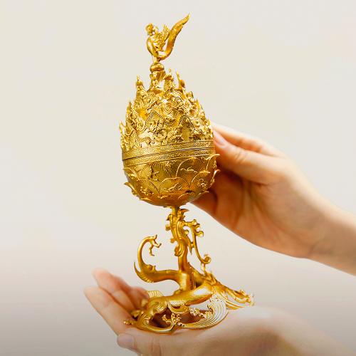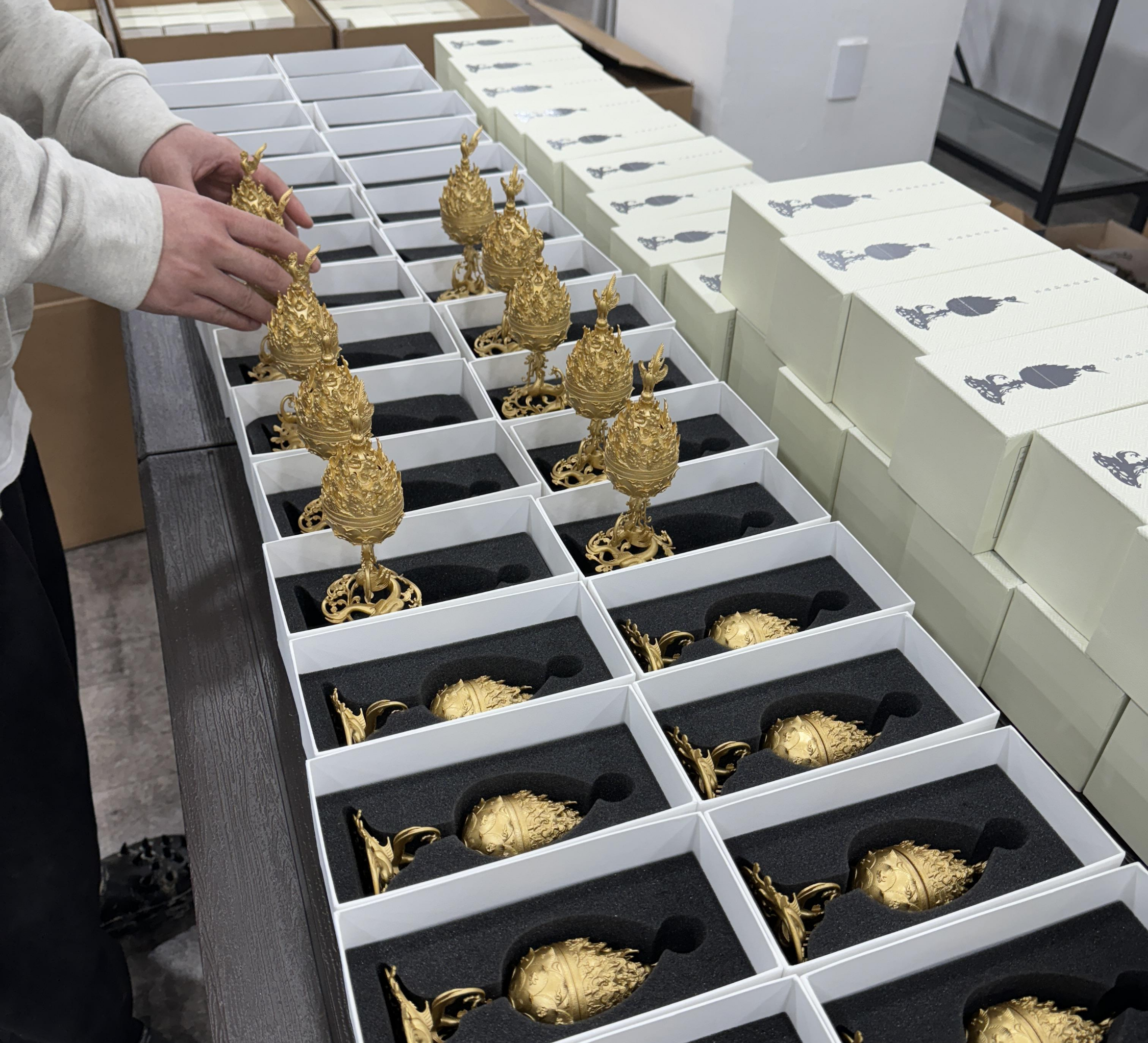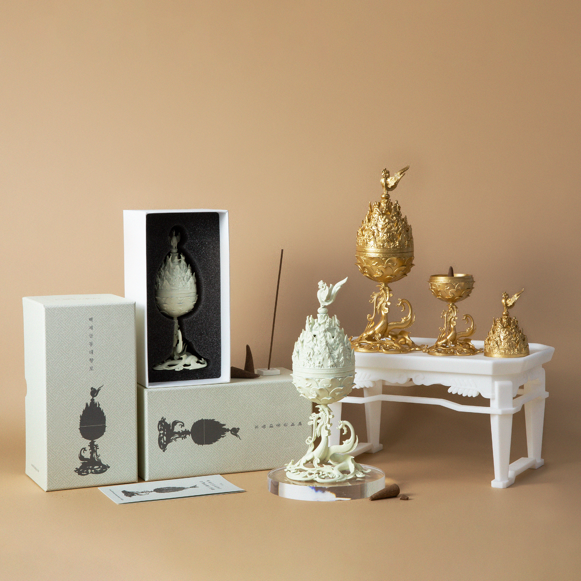 이번 금동대향로 굿즈의 경우, 기존의 가공이나 사출 공정으로는 복잡한 형상을 일정한 품질로 양산하기 어려웠던 제품입니다. 3D프린팅은 이러한 복잡한 형상을 제한 없이 구현할 수 있으며, 이를 통해 금동대향로의 섬세한 디자인과 독특한 형상을 그대로 표현할 수 있었습니다.