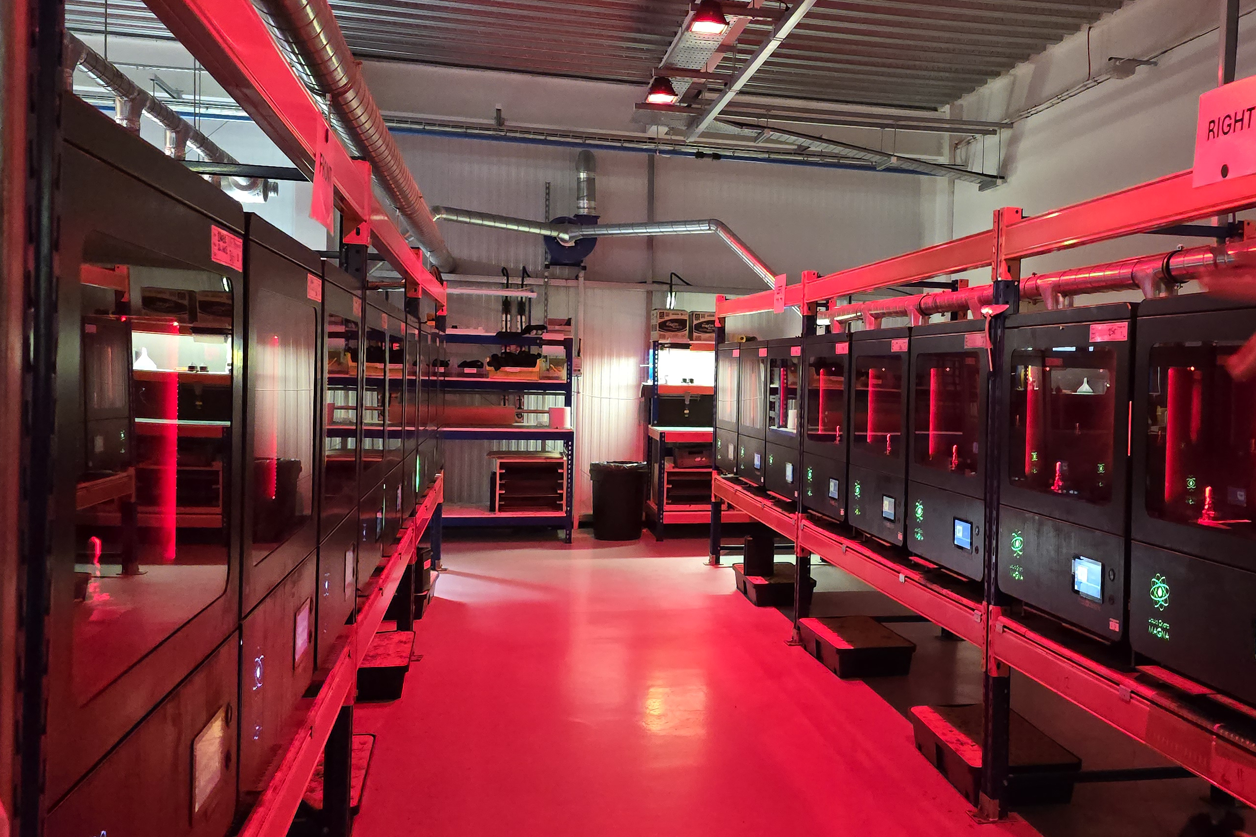 총 170여 명의 직원이 근무하는 이곳의 가장 큰 특징 중 하나는 독자적인 '데이라이트 레진(Daylight Resin)' 기술입니다. 455nm 파장의 가시광선에도 쉽게 경화되는 소재의 특성상, 작업실 전체는 600~700nm 파장의 붉은 조명 아래 운영되고 있었습니다. 약 50대가량의 3D프린터들은 헬멧 내장재와 같은 소비재 부품을 끊임없이 생산하며, 3D프린팅이 소량 프로토타이핑을 넘어 실제 양산 라인으로 기능하고 있음을 증명했습니다.
