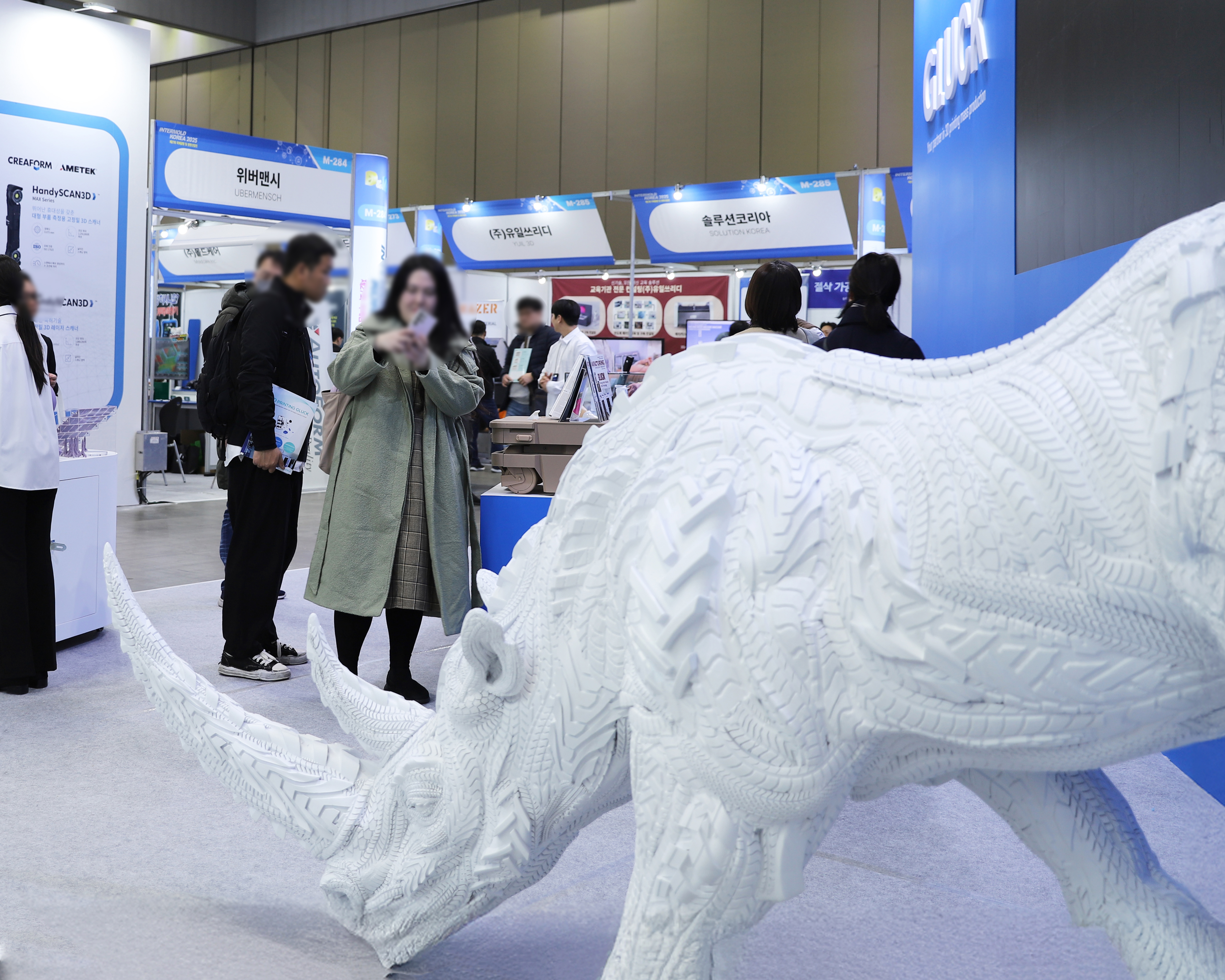 INTERMOLD KOREA 2025 전시회에서 글룩은 2.4미터가 넘는 거대한 코뿔소 조형물을 선보였습니다. 코뿔소의 자연스러운 근육 경계와 피부 주름을 따라 모델을 조각으로 나누고, 각 파트의 표면 품질을 극대화하는 방향으로 출력한 뒤 완벽하게 조립하여 하나의 거대한 작품으로 완성했습니다. 대형 스케일의 프로젝트에서도 디테일을 놓치지 않는 정밀한 3D설계 전문 서비스를 갖추고 있음을 보여줍니다.