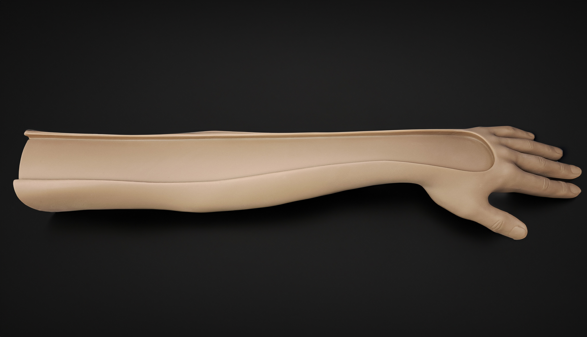 또 다른 사례는 성인 팔 형태의 실리콘 시뮬레이터를 만들기 위한 몰드(틀) 자체를 3D프린팅으로 제작한 것입니다. 실제 인체 비율의 복잡한 곡면과 입체감을 표현해야 하는 이 몰드는, 반복적인 실리콘 복제를 견딜 수 있는 내구성과 완벽하게 매끄러운 표면이 필수적이었습니다.
