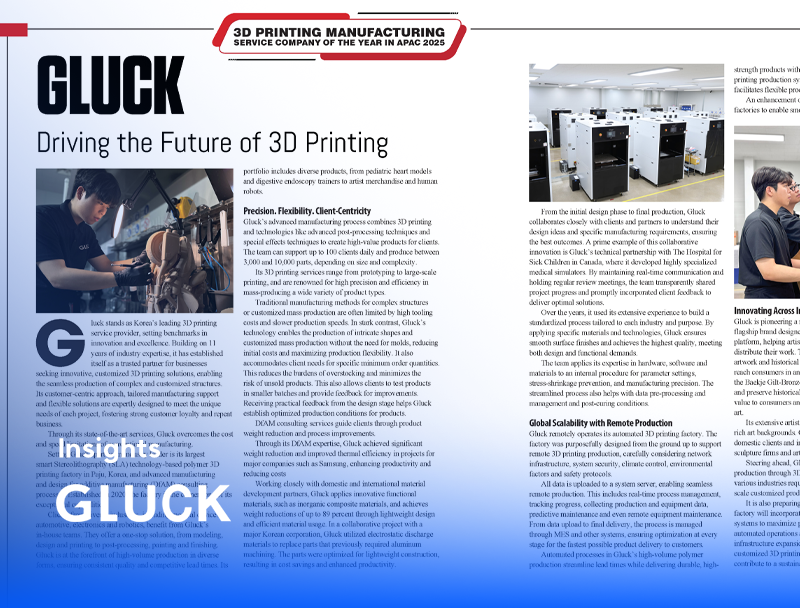 3D프린팅 제조 서비스 글룩 2월호 . 미국의 기술 전문지 매뉴팩처링 테크놀로지 인사이트 (Manufacturing Technology Insights)에서 ‘2025 3D 프린팅 제조 서비스 올해의 기업’ 2025 3D Printing Manufacturing Services Company of the Year 으로 글룩이 국내 3D 프린팅기업으로서 최초 선정되었습니다.자세히 보기 ‘Manufacturing Technology Insights’는 지난 17년간 글로벌 생산기술산업, 첨단소재, 3D 프린팅, 항공 우주 제조 산업, 방위 산업, IoT 등 44가지 항목의 다양한 혁신기술 관련 기사를 다루고 있는 미국 전문 매체로 제조 기술 잡지 분야에서 권위있는 전문지로 인정받고 매거진입니다."11년..